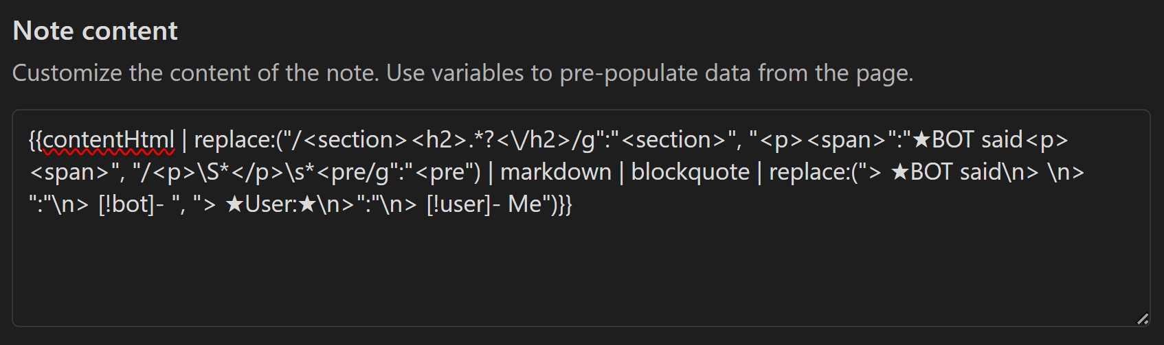 {{contentHtml | replace:("/<section><h2>.*?<\/h2>/g":"<section>", "<p><span>":"★BOT said<p><span>", "/<p>\S*</p>\s*<pre/g":"<pre") | markdown | blockquote | replace:("> ★BOT said\n> \n> ":"\n> [!bot]- ", "> ★User:★\n>":"\n> [!user]- Me")}}